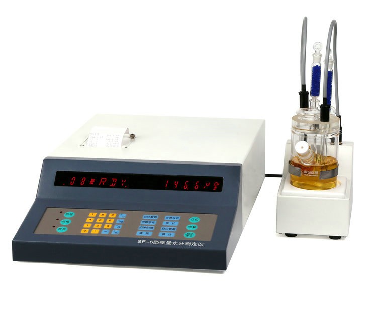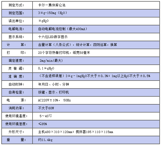 仪器符合GB/T7600;SH/T0246;GB/T606及采用卡尔—费休法测定样品中水分的有关标准。 仪器采用了先进的自动控制电路,电解电流自动跟踪控制,外型结构新颖,从而使该仪器工作更可靠,使用更方便,具有分析速度快(一分钟出结果)、操作简便、精度高、自动性强等特点,同时具有自动打印功能,可将实验结果、做样时间、样品编号自动打印出来,广泛应用于石油、化工、电力、铁路、环保等部门。